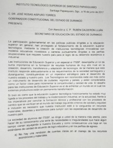 Los comentarios y descontentos han surgido desde el momento en que la alternancia llegó a Durango, en manos del actual gobernador José Rosas Aispuro Torres, pero según la opinión popular no ha realizado los cambios prometidos. Aispuro Torres ha visitado ya el ITSSP en febrero pasado para inaugurar la fachada de la escuela, un domo y hacer entrega de equipo de cómputo y mobiliario, además del anuncio de la construcción de una casa del estudiante foráneo y un laboratorio para la carrera de ingeniería en minería.