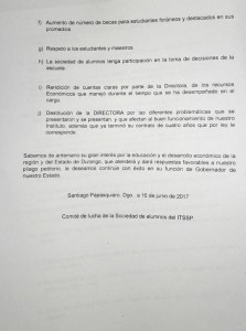 Entre los puntos mencionados en el pliego petitorio realizado por el, autodenominado, Comité de Lucha, se exige la destitución de la actual directora de la institución, la Ingeniero Ana Lilia Lomas Aguirre, quien, a fecha de la protesta, se encuentra fuera de la ciudad. El descontento varía y los alumnos piden un cambio ante una administración que ha faltado en el cumplimiento y mejora de las instalaciones, así como poca transparencia en el uso de recursos, según expresaron miembros del grupo disidente.