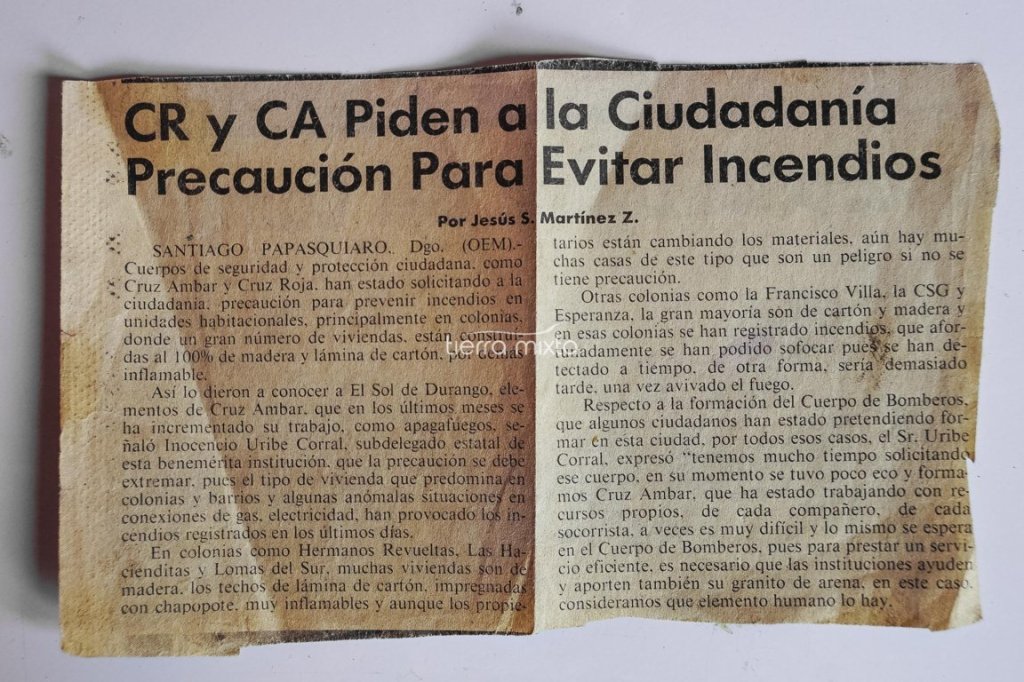 Por un tiempo también se ubicaron frente al Monumento a La Bandera. Radio Brigada de Auxilio de la República Mexicana, Cruz Ámbar, Agrupación Privada, fortalecía su capacidad de respuesta a través de la capacitación de voluntarios que poseyeran una radio de banda civil y pudieran brindar atención diversa en carreteras; la oficina de Cruz Ámbar en Santiago Papasquiaro se ubicó en varios sitios, entre ellos frente al Hotel Santiago que hoy es llamado Sierra Real y después en frente de la segunda calzada en lo que todavía es el Taller Mecánico Uribe, donde Inocencio, junto a sus hijos y otros voluntarios, se mantenían alerta para atender los llamados emergentes, aun teniendo que dejar sus trabajos para acudir a auxiliar a la gente.