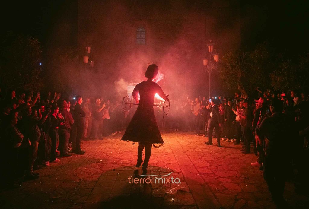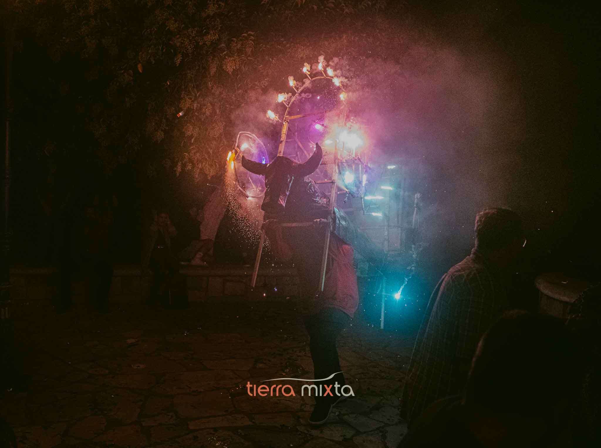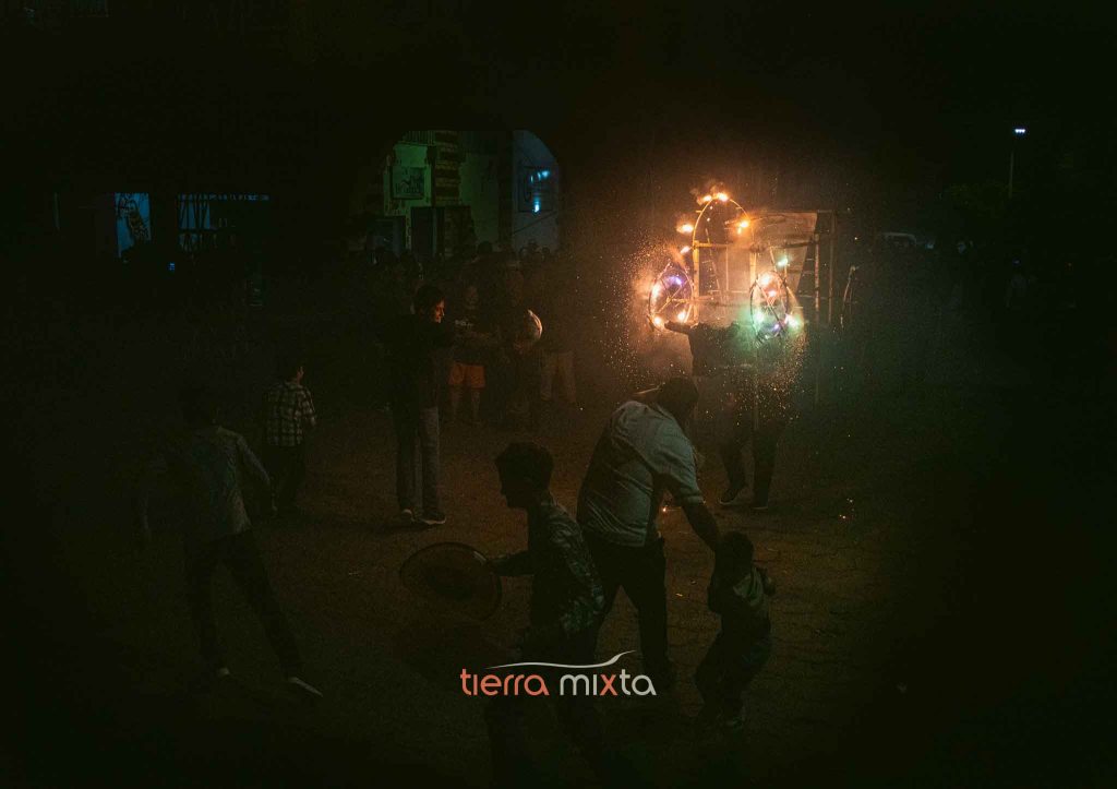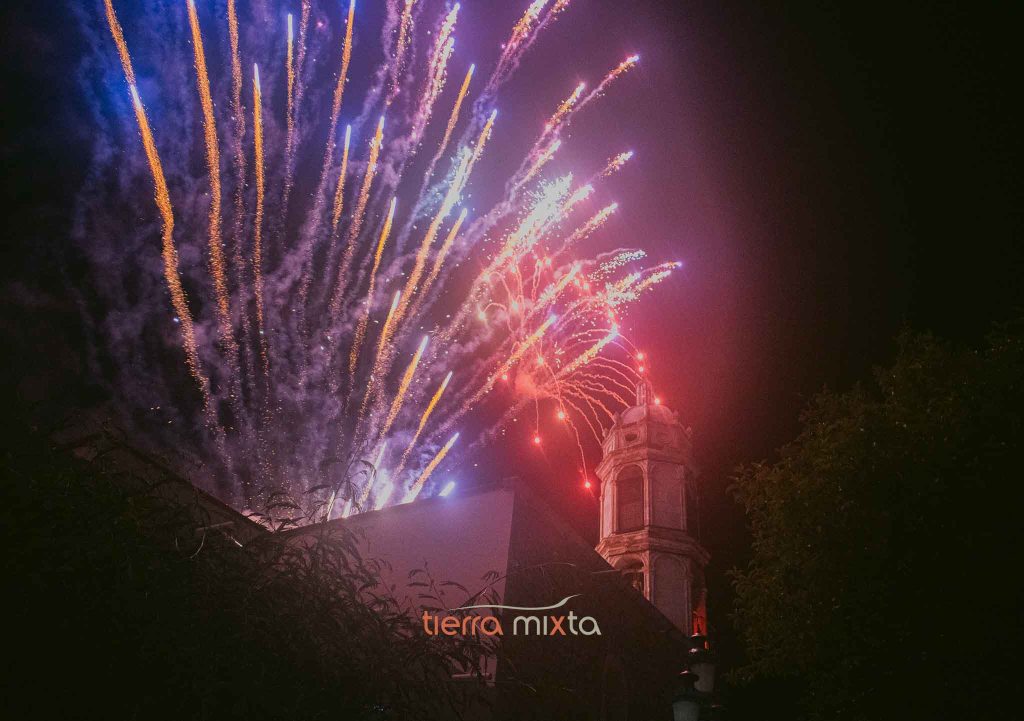 Al finalizar los eventos religiosos, la fiesta se traslada al atrio del templo, donde la gente ya esperaba el acostumbrado espectáculo de pirotecnia. Castillos, toritos y mojigangas fueron el eje de la diversión y la convivencia entre familias santiagueras.