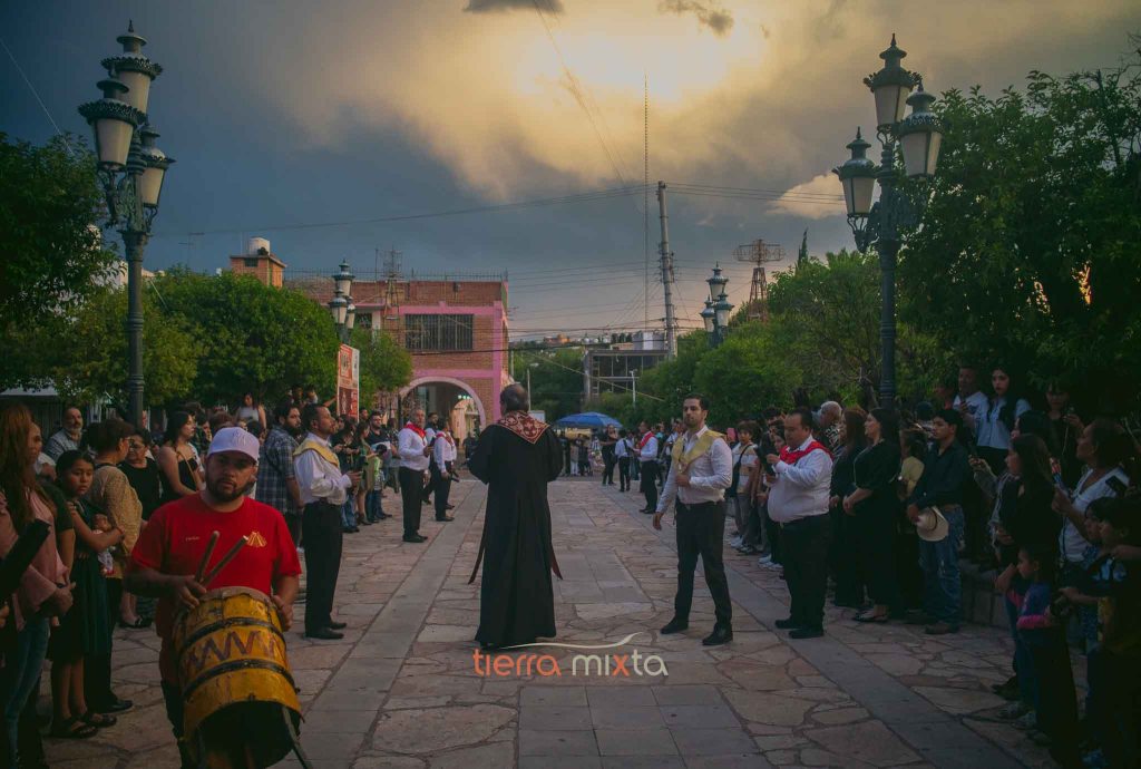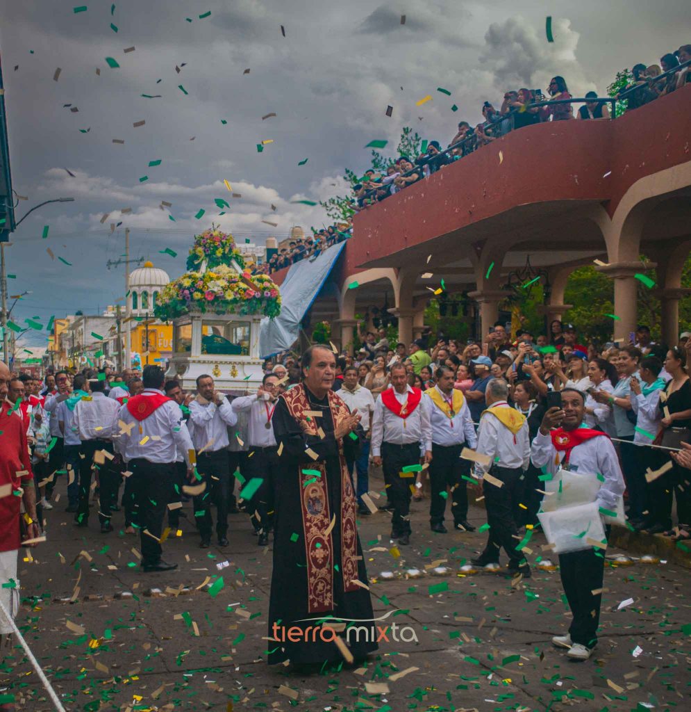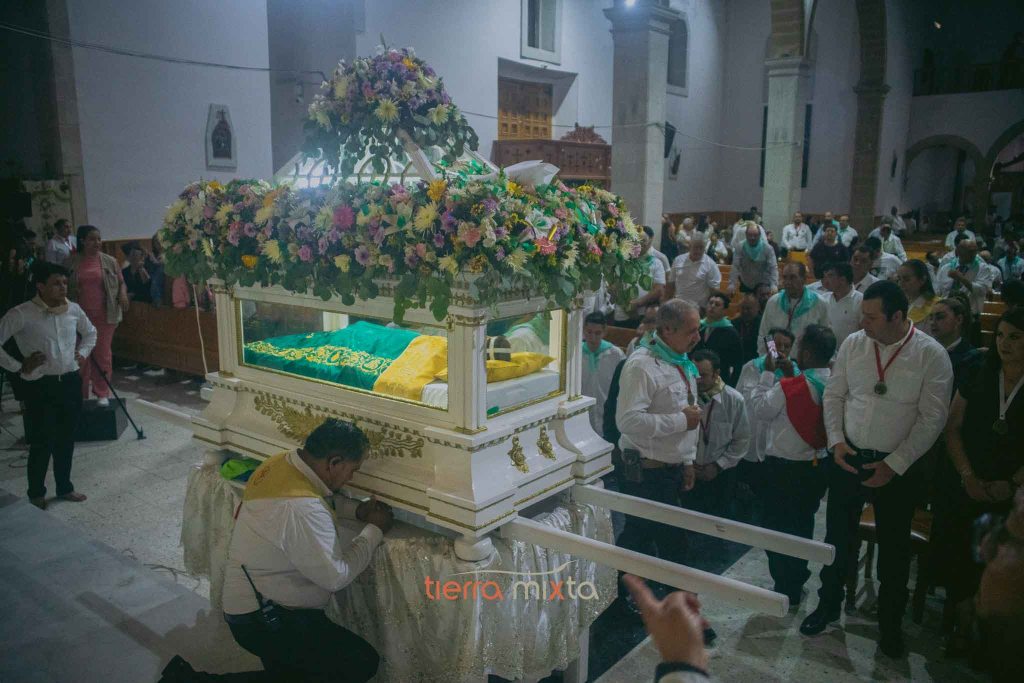 Al llegar a nuevamente al templo de Santiago Apóstol, la imagen fue recibida con destellos de pirotecnia, la banda, los aplausos y una danza de matachines.